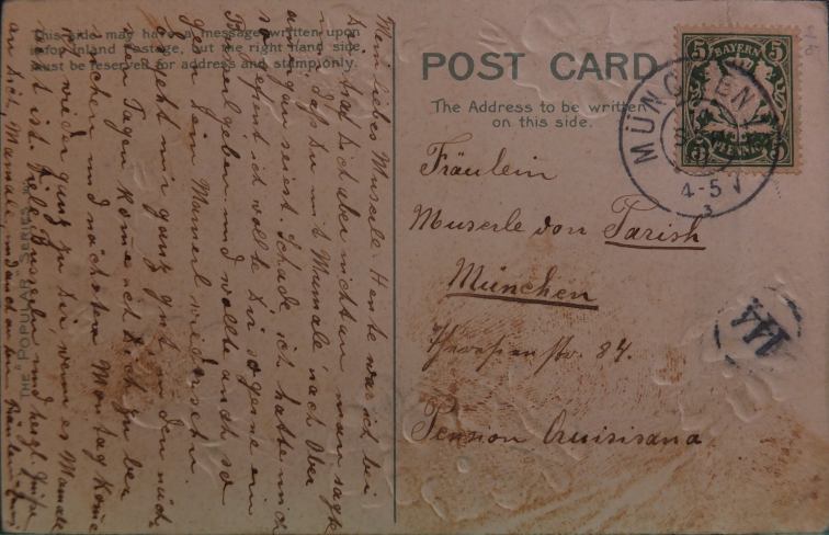 Der Inhalt der Karte vom 19. September 1910 ist ein kleines Kuriosum: Scheinbar schrieb der oder die unbekannte Verfasser:in ein paar Zeilen an die erst dreieinhalbjährige Hermine. Vermutlich musste die Karte dem Mädchen noch vorgelesen werden. Aus den Zeilen geht hervor, dass Hermine von Parish Jun. einen Besuch verpasste, da sie gemeinsam mit „Mamale“ (ihrer Mutter?) eine Reise nach Oberammergau unternommen hatte. Abschließende Grüße gingen auch an das Dienstmädchen Fräulein Emmi.