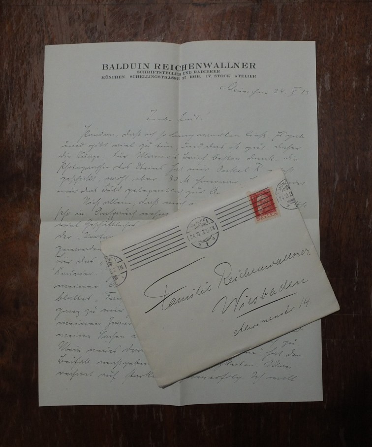 Diesen Brief erwarb ich im August 2023 innerhalb eines Konvoluts verschiedener Kuverts mit Inhalt und Münchner Provenienz. Es ist eine Sendung aus München an die Wiesbadener Familie Reichenwallner, die im ersten Satz mit „Mama“ angesprochen wird. Der sich mitteilende Sohn konnte schnell über den Kopf des personalisierten Briefpapieres identifiziert werden: Balduin Reichenwallner, wohnhaft in der Schellingstraße 37, mit Atelier im vierten Stock des Rückgebäudes. Doch „Wer war Balduin Reichenwallner?“ fragt nicht nur ein Beitrag zur Rechtsphilosophie im Lexikon des Juraforums. Heute ist Reichenwallner weitestgehend vergessen, wenngleich das Stadtarchiv Wiesbaden einige Archivalien zu seiner Familie aufbewahrt.