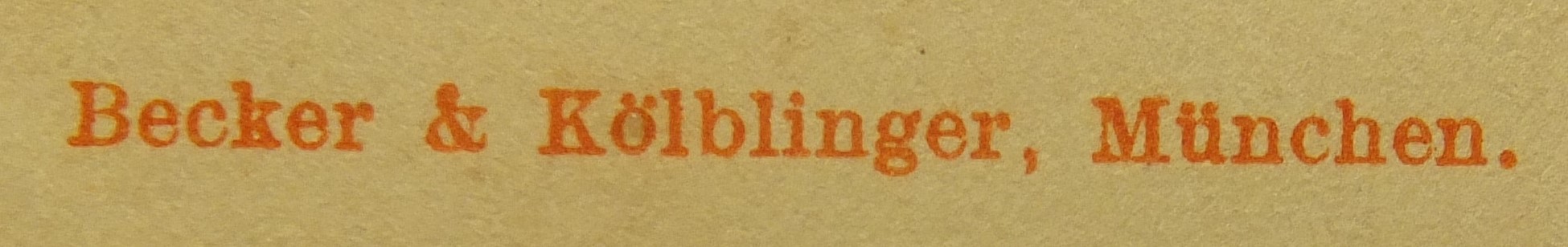 | Schreibweisen und Abkürzungen | Becker & Kölblinger ⎖ B u. K M. ⎖ Ferd. Kölblinger ⎖ H. B. M. ⎖ Hermann Becker ⎖ Verlag Ferdinand Kölblinger ⎖ Verlag Hermann Becker ⎖ Verlag v. Becker & Kölblinger ⎖ Verlag von F. Kölblinger |