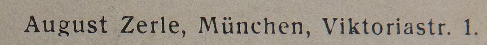 | Schreibweisen und Abkürzungen | August Zerle ⎖ Buchdruckereigeschäft ⎖ Buchdruckerei und Ansichtspostkarten-Verlag ⎖ Katholische Ansichtspostkartenhandlung ⎖ K. Zerle ⎖ Kirchenverlag Wies ⎖ Kunstanstalt A. Zerle ⎖ R. Zerle ⎖ Verlag August Zerle |
