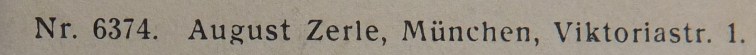 | Firmengeschichte | Die Firma scheint hauptsächlich von August Zerle geführt worden zu sein. In den frühen Jahren tritt parallel dazu ein K. Zerle in Erscheinung, was aber auch mit „Katholische Ansichtspostkartenhandlung Zerle“ aufgelöst werden könnte. Ansonsten scheint der Familienbetrieb mit zwei Geschäftszweigen vom Ehepaar August Zerle (Druckerei) und Rosa Zerle (Verlag) betrieben worden zu sein. Beide Kürzel existieren parallel, wobei Rosas Name nie ausgeschrieben erscheint. 1907: Erste mir bekannte Postkarte von K. Zerle Seit 1920: Die Firma annonciert als chemisches Labor, nicht aber zur fotografischen Entwicklung sondern Wanzen, Ratten und Mäuse vernichten zu können Juni 1921: Der Generalvertreter der Firma, Gustav Guffert, verstirbt plötzlich nach kurzer Krankheit. Er war scheinbar seit den Firmengründerjahren Teil der Belegschaft. 1925: August Zerle annonciert als „Größter Ansichtskartenverlag Südbayerns“. 1928: Die Firma Zerle inseriert im Branchenadressbuch für München: „Renommiertester Ansichtskartenverlag Südbayerns. Erstklassige Herstellung von Echt-Photokarten und Photobildern bis 24 × 30 in Auflagen ab 1000 Stück aufwärts.“ 1929: August Zerle annonciert auf der Suche nach Angestellten, die in Bayerns Bezirken als reisende Händler auf Provisionsbasis Postkarten verkaufen. 1932: Im Juli meldet die Graphische Kunstanstalt August Zerle Konkurs an. 1933: Unter der Firmenadresse Gabelsbergerstraße 30 gibt Rosa Zerle weiterhin Postkarten heraus. 1960er Jahre: In den frühen 60er Jahren scheint das Geschäft aufgegeben worden zu sein. |