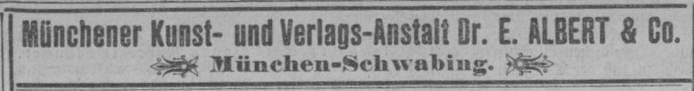| Schreibweisen und Abkürzungen | Verlag Dr. E. Albert & Co., München ⎖ Münchner Kunst- und Verlagsanstalt Dr. E. Albert & Cie. ⎖ Münchner Kunst- und Verlags-Anstalt Dr. E. Albert & Co. Nicht zu verwechseln mit der Firma seines Vaters: Kunstverlag Josef Albert, Kaulbachstraße 51 |