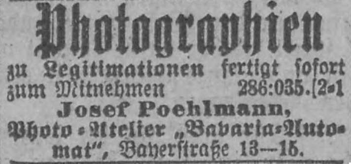 | Quellen | Adreßbuch für München 1904 und 1928 ⎖ Ansichtskarten sammeln ⎖ HOLLWECK, Ludwig (Hrsg.): München in alten Ansichtskarten, Frankfurt 1977, S. 7. ⎖ Illustrierter Sonntag, 15.12.1929 ⎖ Münchener Zeitung No. 264 vom 24. Sept. 1929 |