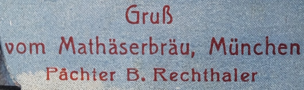 | Pächter des HB als Postkartenverlger | – 18. Pächter: Karl Mittermüller, Pächter 1906–1919 – 19. Pächter: Johann „Hans“ Panzer, Wirt 1919–1930 – 20. Pächter: Hans Bacherl (* vor 1895), Wirt von 1930–1945 – 21. Pächter: Valentin Emmert, Wirt von 1945–1950 – 22. Pächter: Franz Trimborn (* 25.11.1899), Wirt 1950–1960 – 23. Pächter: Toni Steiner, Wirt 1960–1970 Aus den 1950er Jahren ist außerdem der Hofbräuwirt H. Glanegger bekannt |