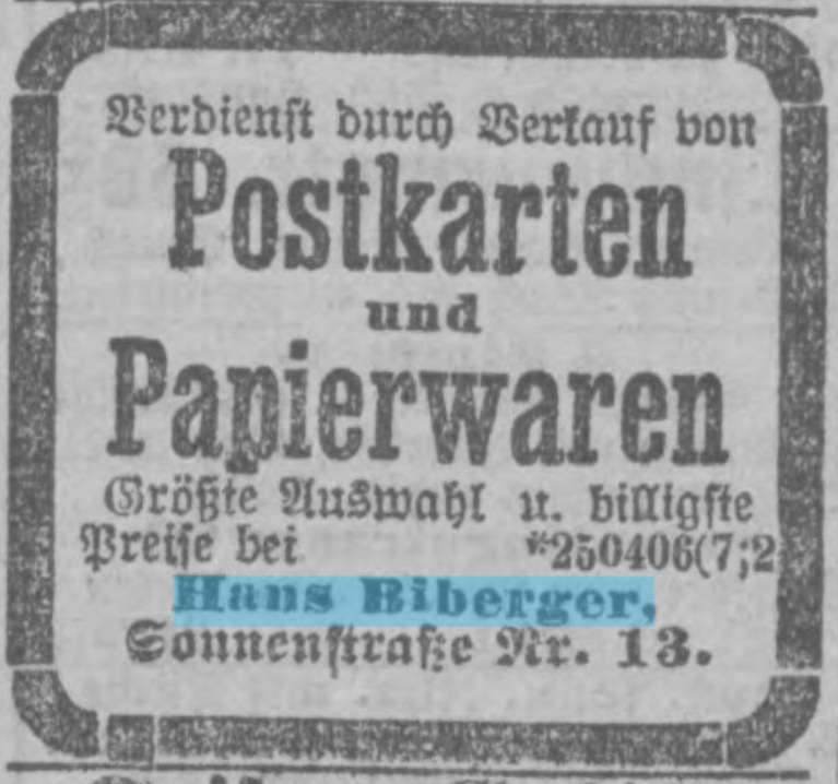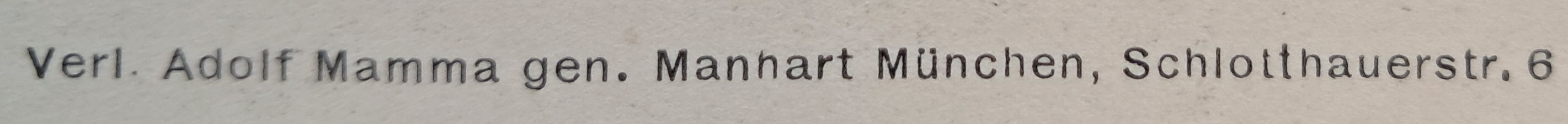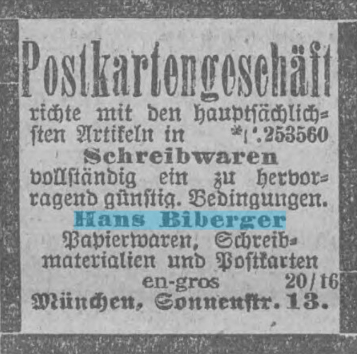 | Quellen | Adreßbuch für München 1904 und 1928 ⎖ Ansichtskarten sammeln ⎖ HOLLWECK, Ludwig (Hrsg.): München in alten Ansichtskarten, Frankfurt 1977, S. 7. ⎖ Illustrierter Sonntag, 15.12.1929 ⎖ KUGLER, Adolf: Münchner Ansichtskarten. Anmerkungenzu ihrer Geschichte, in: Aus dem Antiquariat 3, 1988, S. 110–127 ⎖ Münchener Zeitung No. 264 vom 24. Sept. 1929 |