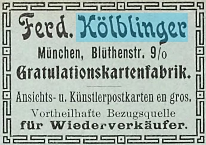 | Firmengeschichte | 1895: Erstmals taucht im Münchner Adressbuch die Papierprägeanstalt Ferdinand Kölblinger auf. Kurze Zeit später wird das Angebot um Ansichts-, Gratulations- und Künstlerpostkarten erweitert. Um 1900: Ferdinand Kölblinger schließt sich mit Hermann Becker zusammen. Laut Münchner Adressbuch tritt die Firma unter dem neuen Doppelnamen ab 1902 in Erscheinung. Es existieren aber Postkarten mit Imprint, die eine frühere Zusammenarbeit von Becker und Kölblinger belegen. August 1900: Bei der Ansichtskartenausstellung in der Münchner Schrannenhalle erreicht Ferdinand Kölblinger einen zweiten Platz. Neben einer Urkunde erhält die Firma eine Silbermedaille. Diese stammt vom Betrieb Oskar Consée ↩, deren Inhaber auch Teil der Jury ist. 1905: Die Firma bringt eine sogenannte Kinematographpostkarte heraus, eine Zugkarte auf der verschiedene Ansichten Münchesn zu sehen sind. 1907: Hermann Becker bestätigt den Firmeneintrag im Handelsregister und verlängert die Geschäftsbedingungen für mindestens ein weiteres Jahr. Geschäftsführer sind Hermann Becker und Karl Uebelen. 1908: Die Firma Becker & Kölblinger muss Konkurs anmelden. 1909: Der Verlag Hermann Becker scheint aus dem vorherigen Verlag „Becker & Kölblinger“ hervorzugehen. Ferdinand Kölblinger ist in der Folge als eigenständige Warenagentur (erst Schellingstraße, dann am Rindermarkt) im Münchner Branchenbuch gelistet. 1912 berichten die MNN allerdings von einem „Verlag“ F. Kölblinger, der Propagandamarken verausgabt. 1910: Für ein Jahr ist der Alleinverlag Hermann Becker in der Königinstraße gemeldet. 1915: Der Kunstverlag Hermann Becker ist in der Kaulbachstraße bei der Inhaberin Berta Becker registriert. 1920: Ferdinand Kölblinger war offensichtlich in den vergangenen Jahren in Südamerika unterwegs, möglicherweise um Postkartenmotive und Kolonialwaren für seine Warenvertretung zu besorgen. Die MNN berichten darüber, dass „die Herren Dr. Garnier und F. Kölblinger die Auswanderungslustigen über die Ansichten in Paraguay unterrichteten und die Eindrücke schilderten, die sie von Land, Leuten und Wirtschaft bekommen haben.“ 1933: Der Verlag existiert weiterhin, Nachweis hierfür sind Postkarten mit Porträt und Schriftzug „Reichskanzler Adolf Hitler“, die im Namen des Verlages vertrieben werden. |