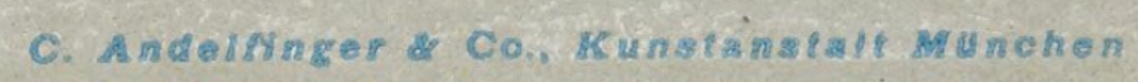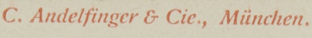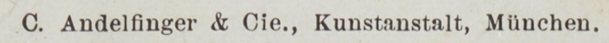 | Schreibweisen und Abkürzungen | C. Andelfinger ⎖ Carl Andelfinger & Co. ⎖ C. Andelfinger & Cie. ⎖ C. & Cie. Kunst- und Verlagsanstalt ⎖ Karl Andelfinger ⎖ C. Andelfinger & Cie., Kunstanstalt ⎖ C. A. & Co. ⎖ C. A. & Cie., M. Nich zu verwechseln mit: Büro-Aktiengesellschaft C. Andelfinger & Co., Dachauer Straße 10 |