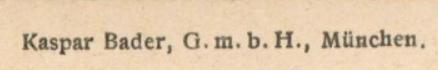 | Firmengeschichte | 1890: Firmengründung. 1900: Die Firma Kaspar Bader stellt an Münchner Bahnhöfen Waren- und Postkartenautomaten auf. Verkauf von Schokolade, Bonbons, Zigarren und Vielem mehr. 1910: Überführung der Firma Kaspar Bader in eine GmbH und Löschung des Firmennamens Kaspar Bader. 1912: Seit diesem Jahr werden die bisherigen „mit Ornamenten überladenen“ Automaten der Firma durch moderne mit zweckmäßiger Form ersetzt. 1915: Die Prokura des Anton Krieger für die Automaten GmbH Bader wird aus dem Handelsregister gelöscht. 1916: Die Geschäftsführung geht von Gustav Burbach auf den Kaufmann Josef Welty über. 1917: Die Geschäftsführung geht vom Kaufmann Josef Welty auf den Kaufmann Mathias Illig über. 1919: Anton Krieger wird zunächst zusätzlicher Geschäftsführer neben Mathias Illig, letzter wird jedoch späterim Jahr aus dem Handelsregister ausgetragen. 1932: Die Kaspar Bader GmbH ist weitehrin aktiv, wie aus Gesellschafterversammlungen hervorgeht. 1942: Der Geschäftsführer Anton Krieger scheint die Firmenräumlichkeiten während des Krieges in seine Wohnung in der Jahnstraße 22 verlegt zu haben. Möglicherweise wird das Geschäft in der Blumenstraße bei einem Bombenangriff zerstört oder beschäfigt. 1955: Im Telefonbuch ist weiterhin eine Firma Kaspar Bader HR Automaten gelistet. |