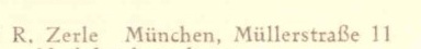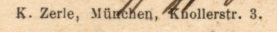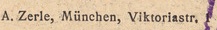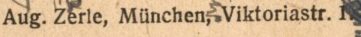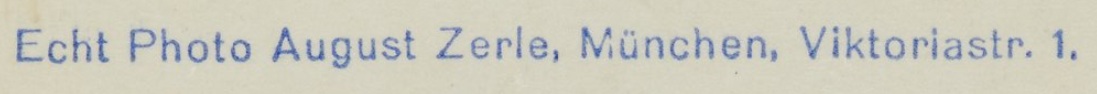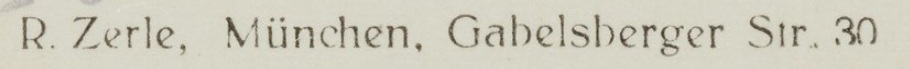 | Firmengeschichte | Die Firma scheint hauptsächlich von August Zerle geführt worden zu sein. Ansonsten scheint der Familienbetrieb mit zwei Geschäftszweigen vom Ehepaar August Zerle (Druckerei) und Rosa Zerle (Verlag) betrieben worden zu sein. Beide Kürzel existieren parallel, wobei Rosas Name nie ausgeschrieben erscheint. In den frühen Jahren tritt parallel dazu ein K. Zerle in Erscheinung, was mit „Katholische Ansichtspostkartenhandlung Zerle“ aufgelöst werden darf. 1907: Erste mir bekannte Postkarte von K. Zerle Seit 1920: Die Firma annonciert als chemisches Labor, nicht aber zur fotografischen Entwicklung sondern Wanzen, Ratten und Mäuse vernichten zu können Juni 1921: Der Generalvertreter der Firma, Gustav Guffert, verstirbt plötzlich nach kurzer Krankheit. Er war scheinbar seit den Firmengründerjahren Teil der Belegschaft. 1925: August Zerle annonciert als „Größter Ansichtskartenverlag Südbayerns“. 1928: Die Firma Zerle inseriert im Branchenadressbuch für München: „Renommiertester Ansichtskartenverlag Südbayerns. Erstklassige Herstellung von Echt-Photokarten und Photobildern bis 24 × 30 in Auflagen ab 1000 Stück aufwärts.“ 1929: August Zerle annonciert auf der Suche nach Angestellten, die in Bayerns Bezirken als reisende Händler auf Provisionsbasis Postkarten verkaufen. 1932: Im Juli meldet die Graphische Kunstanstalt August Zerle Konkurs an. 1933: Unter der Firmenadresse Gabelsbergerstraße 30 gibt Rosa Zerle weiterhin Postkarten heraus. 1960er Jahre: In den frühen 60er Jahren scheint das Geschäft aufgegeben worden zu sein. |