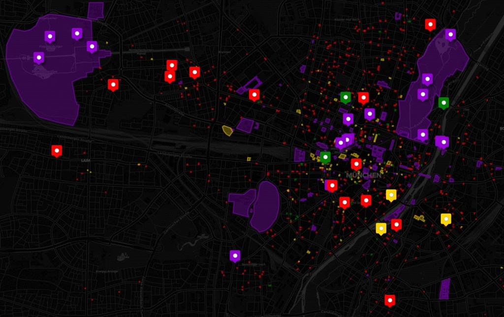 Klicken Sie auf die Karte um eine interaktive Ansicht in einem neuen Tab zu öffnen. Wandeln Sie durch Münchens Gassen. Jeder farbige Punkt lässt sich anwählen und gibt Informationen zu Münchner Geschichten.